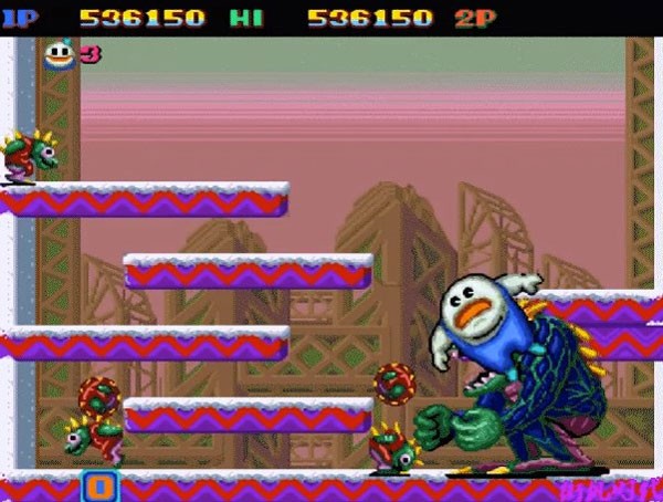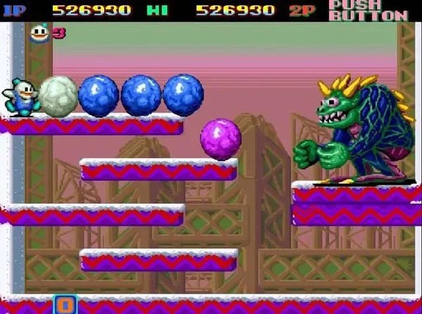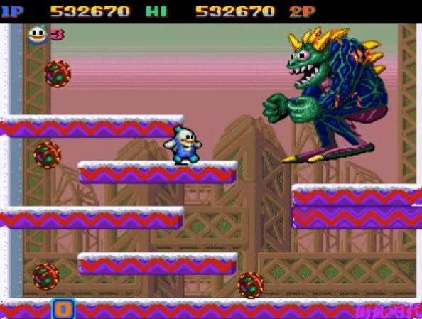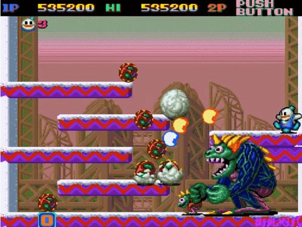 3、《雪人兄弟》有一个有趣的设定,玩家只要坚持一段时间就可以直接过关,BOSS是否被打死无关紧要。尝试在不消灭敌兵的情况下,直接跳到BOSS背后使用普通攻击。然而,即使一直坚持到过关,BOSS也没有被打死。也就是说,BOSS很可能无法被子弹射死。但事实真的是这样吗?