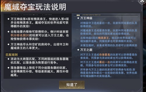 魔域夺宝是一个限时挑战活动,玩家可以和其他服务器的玩家一起进入魔域,争夺宝藏。每周一和周五晚上8点30分开放,活动持续半小时,玩家等级需要达到170级才能参加。