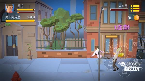 游戏中的按键设置非常简单,左侧的虚拟摇杆控制移动,右侧的按钮则用来释放不同的连招,如踢、拳、抓、跳和防御等。每个按钮都单独设置,方便玩家操作。成功挑战关卡后可以获得橘子,游戏左上角显示玩家的血量、关卡完成度和挑战难度等级。