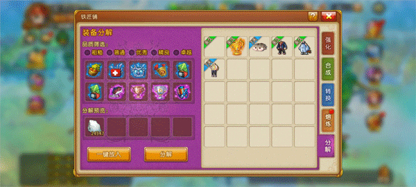 首先,点击主界面上的铁匠铺,选择分解,然后在左侧会出现不同品质的道具。你可以挑选这些道具进行分解,或者一键全部放入分解槽,每次最多可以分解10个道具!