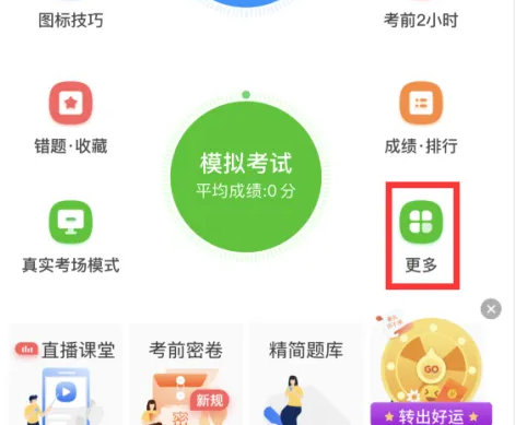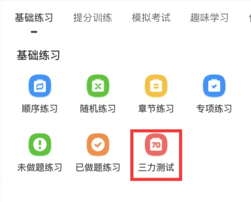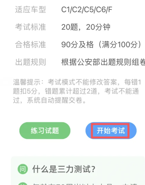 手机打开元贝驾考APP后,点击下方“考试”。进入考试界面,点击“更多功能”。点击“三力测试”。点击“开始考试”即可。...