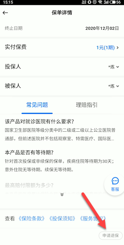 点击*下方的申请退保图标,填写退保理由后就可以退保了。