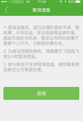 第三步:进入“取消选座”页面,查看选座注意事项,并点击【继续】;