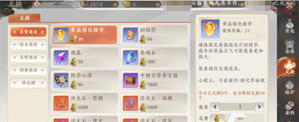 其五,玩家可以找到游戏当中的名望商店,商店也有精华供玩家自由兑换,但是这个也有限购的,每个玩家最多一天兑换十个哦!除了这些以外,还有一种只需要玩家能够持续登陆在线一个半小时就能够得到在线礼包,在线礼包当中同样也会出现黄晶强化精华的身影。