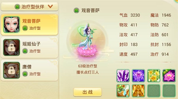 治疗型伙伴用唐僧和观音都是不错的选择。个人感觉观音的奶量比较足,持续治疗能力很不错;而唐僧拉血线更好用,保命也相对来说更好些。不建议大家用瑶姬仙子,因为她无论是在治疗能力还是被动技能上,都不如其他两位。