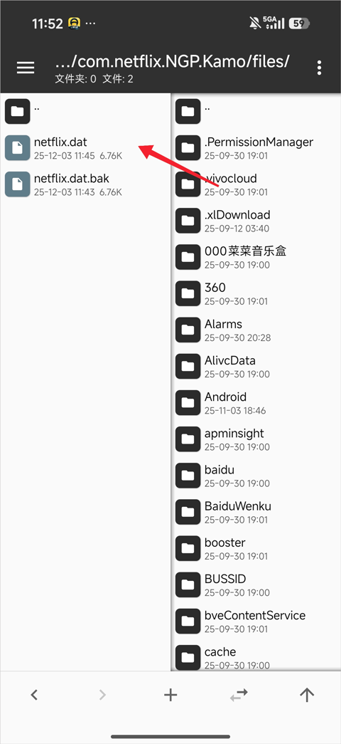 2、在列表中即可看到荒野大镖客救赎手机版的游戏目录,一般名称为com.netflix.NGP.Kamo,进入该文件夹后,继续打开Files目录。
