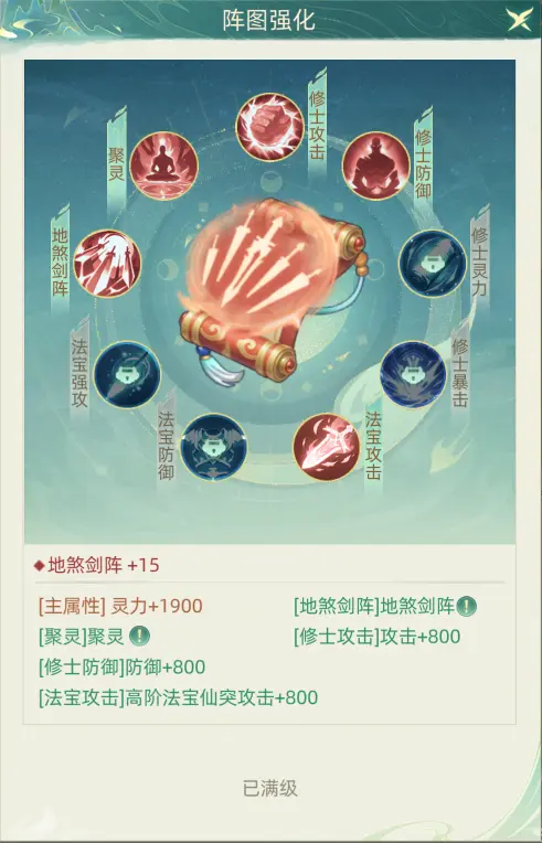 初始携带4技能神品阵图15级满级属性详解: