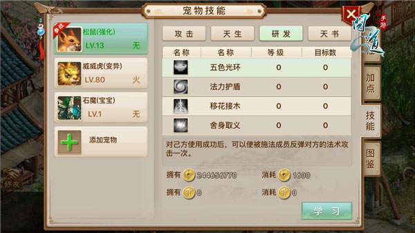 技能对于一个强力宝宝来说肯定也是不可或缺的,宠物的技能分为4类:攻击、天生、研发、天书。