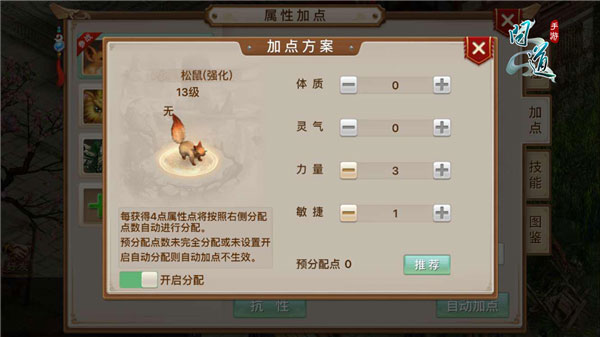 如下图所示,可以自行设置属性点的分配方案,设置完后,将左下角“开启分配”的开关打开才能够生效。如果开启这个功能,那当宠物获得属性点时,就会按照自动加点里保存的方案进行分配。