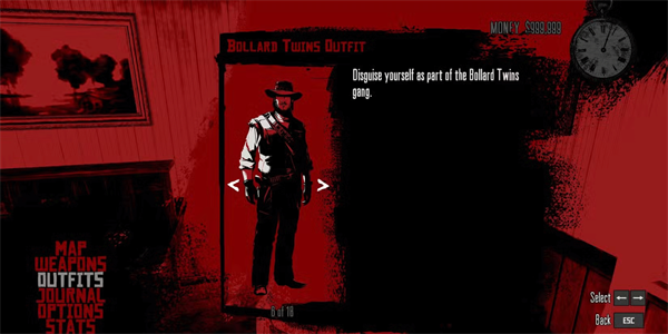 解锁方式:完成一系列步骤:在盗贼码头附近搜索,在麦克法兰牧场夜间巡逻,赢得马蹄铁小游戏,获得波拉德双胞胎赏金(存活),击败亨尼根庄园,在盗贼码头的裁缝处购买这套衣服。