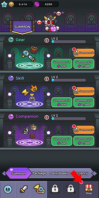 3、点击游戏界面右下角可进入商店,其中第一个是装备商店,第二个是技能商店,第三个是宠物商店,你可以根据自己的需求进行抽取。