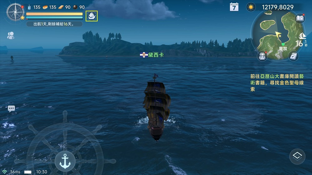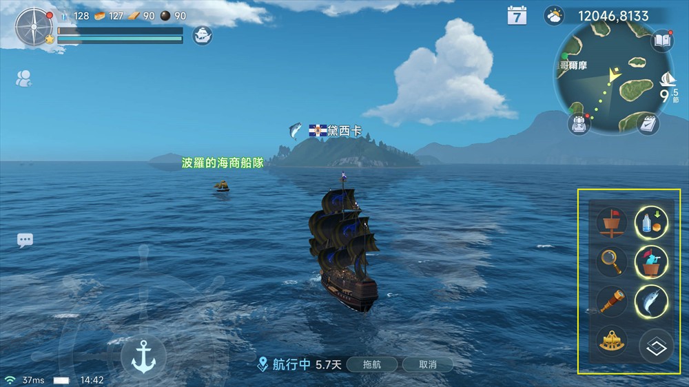 在航行过程中,通过右上角的小地图可以了解自己的位置和坐标,点击即可跳转到主地图;右侧的小图标显示的是当前航速,1节等于1.852公里/小时。展开天气图标,可以查看影响航速的风力、风向、浪高和浪向。