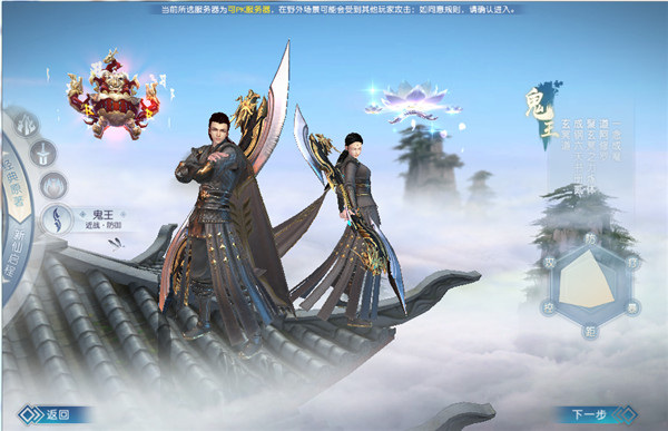 鬼王宗内藏修罗之力,行事神秘莫测,造型霸气,大刀横扫千军。鬼王是坦克型职业,具有控制技能,并吸收了西域修罗界的咒法,还能召唤天魔元神提升实力。50级时可修炼至第三重“邪冥”,掌握“猛火咒”等技能,刀锋如烈焰,所向披靡。