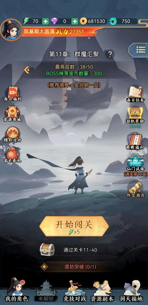 4、然后开始挑战主线任务,收集修仙所需的资源,点击“开始挑战”按钮。
