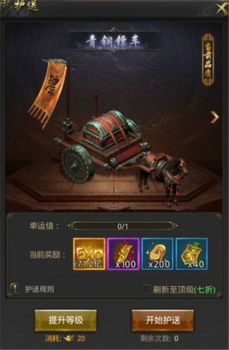 5、在镖局内刷新提升镖车品质,完成护送任务可以获得经验、贡献和荣誉等奖励。