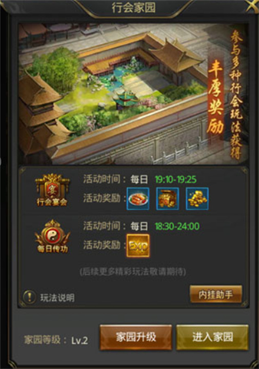 行会家园是每日行会宴会和传功的场所。每天19:10-19:25,家园会开启行会宴会,成员可以在此答题和挂机,获得丰富的经验、材料和道具奖励。此外,每天18:30-24:00,还会开启每日传功,成员之间互相传功可以获得大量经验奖励。
