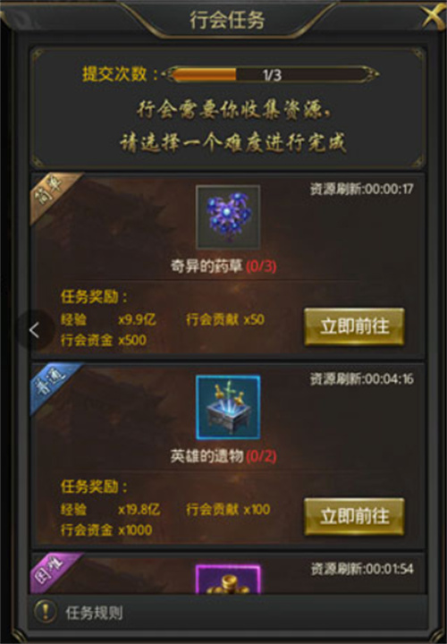 每个成员每天可以完成三次行会任务。在暗域一层,你需要采集指定的道具并提交。可采集的道具有三种:奇异的药草、英雄的遗迹和散落的金器。道具从左到右稀有度逐渐增加,提交越稀有的道具,获得的收益也越高。不过,暗域一层是中立地图,不同行会的成员可以互相PK哦!