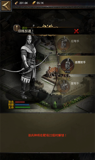 2、兵营,马厩,战车工坊,这三个建筑都是出产士兵的,等级的高低直接影响士兵等级的高低,建议所有的出兵建筑等级都要同步于城堡的等级,提升效果很高的。