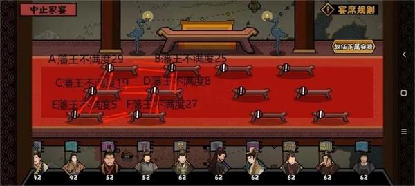 家宴初始条件要求威望在80以上,第一次开始家宴,之后的家宴是在每一年都会有一次(前提:不会叛变)。其中注意的是吴王表示拒绝参加家宴,他怕忍不住打死景帝(设想情景)。