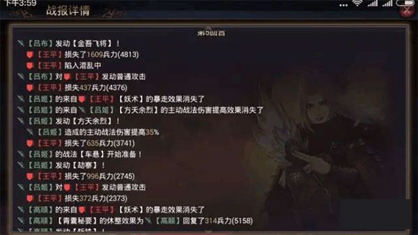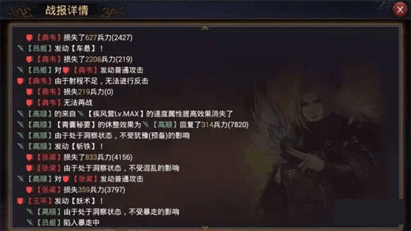 吕姬的伤害虽然不是非常稳定,但上限很高,单次车悬的伤害最高能达到3007,不夸张的说,这个数字已经接近夏侯渊的车悬伤害了,劫寨的伤害值也有1000-2000左右,对于一个四星武将加四星战法来说这个数字算很不错了。而另一方面,高顺的作用也体现的很明显,不仅无视了反计和妖术的控制,还用廉价战法斩铁对对方造成了控制效果。