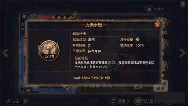 方天余烈,使自身主动战法伤害提高35%并且每回合对敌军单体造成一次80%的攻击。看到这100%的发动几率和每回合固定的伤害值你是不是想到了关妹?那么就来对比一下二者吧。