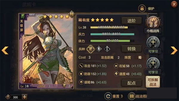 前锋貂蝉,全谋略加点,战法【三军之众】【兵无常势】,貂蝉带三军和兵无常势提高了回复和坦度。