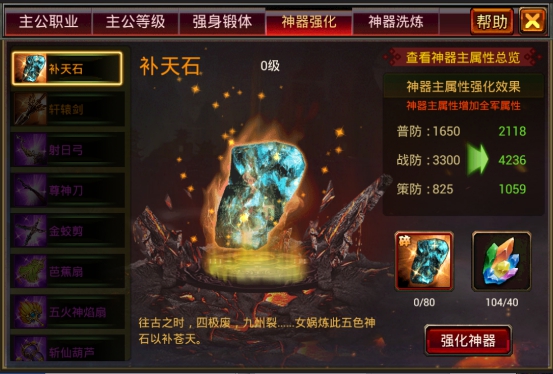 消耗对应的神器碎片及五色石可以提升神器的强化等级,神器碎片和五色石均可以通过银矿战获得。打开过关斩将的通关奖励宝箱也可以获得五色石。