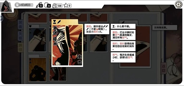 压缩卡组到五张,开激进重击,触发诱饵后手回手激进重击并抽回自己,蓄势弃一牌回一怒,触发诱饵后手回手蓄势并抽回自己和弃牌,循环攒怒,满怒后再开激进重击,达成循环。因为洗脑删光了激进重击的动作,所以开它不需要费用。因为对事件和卡牌要求得比较死,所以没必要专门凑,做其他流派时顺带做就行。