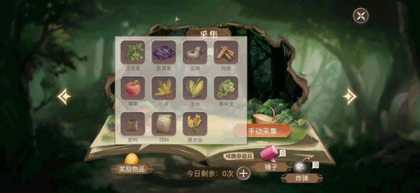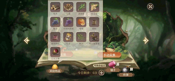 游戏中有些材料,无法通过种植和养殖获得,只能通过另一个地图中的“采集、打猎、挖矿(尚未开通)”获得,比如:百里香、白玉涅、榆木、豆蔻、薄荷等等,这些材料是主线任务必需的,也是星座任务和传记任务必需的(星座和传记我后面会讲),而采集、打猎、挖矿的次数每天只有三次,即使使用钻石购买次数,也只能额外购买三次,也就是我开头说的3+3。