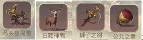 T3级别:马头鱼尾兽、白额神鹿、狮子之剑、公允之章(简称马头、白鹿、宝剑、公章)