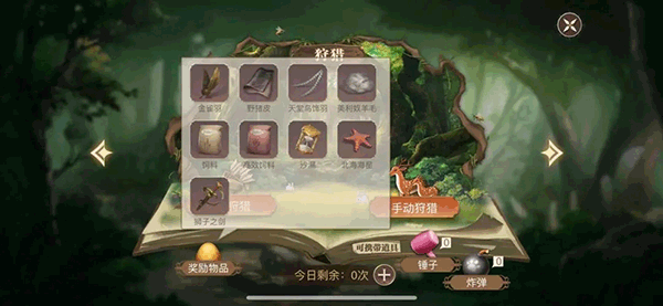 打猎地图分为:黑森林、迷雾深林、皇家森林(男爵V开启)、秘境森林(二等子爵V开启)