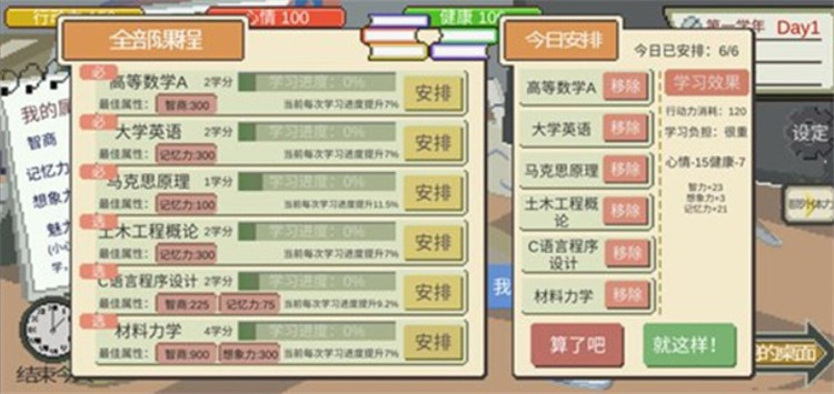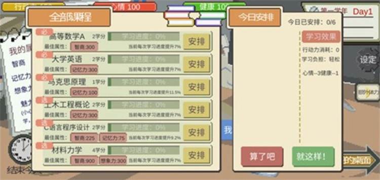 5、每上完一门课都会消耗一定的行动力,类似于体力,用完就不能进行其他活动了。