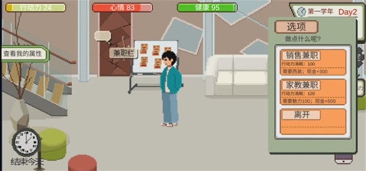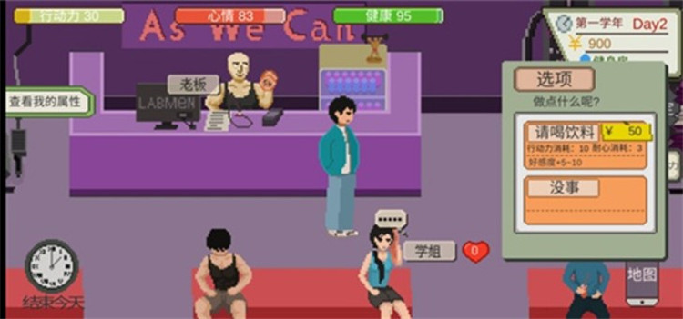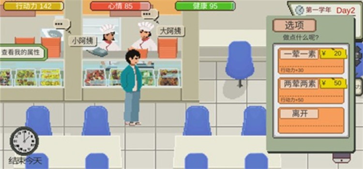 8、在食堂用餐、购买饮料可以恢复行动力,在公园里和大树聊天可以提升智力,虽然可能会稍微降低心情,但去健身房锻炼能增加健康和魅力,记得带上现金。