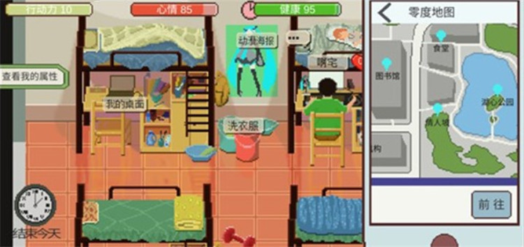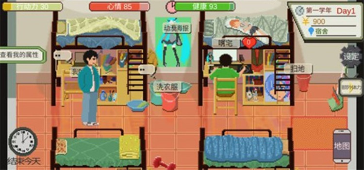 6、宿舍是你活动的主要场所,室友【啊宅】可以与你互动,增加好感,还能提供一些帮助。别忘了做一些家务,如洗衣和拖地,这有助于提升你的健康。