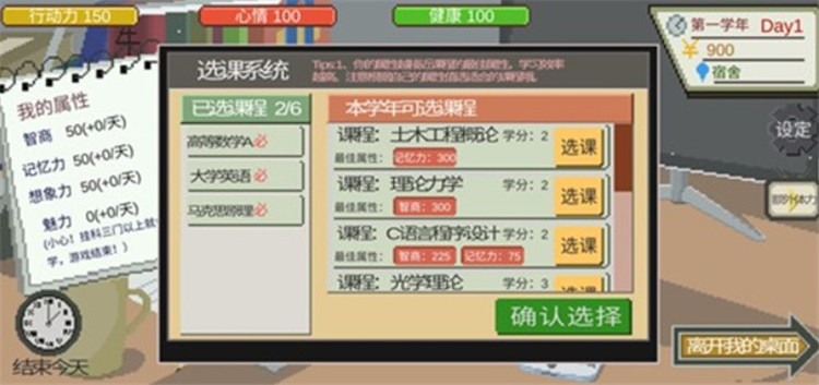 3、拿到生活费后,点击电脑开始选择课程。必修课包括高等数学、大学英语和马克思主义原理,选修课则可以根据兴趣自由选择,但每门课程都需要满足特定属性要求才能顺利毕业。