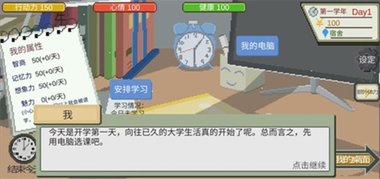 1、进入游戏后,你会发现自己正身处宿舍,桌上摆放着电脑、学习计划和手机等物品。左边的屏幕会显示你的个人信息,便于随时查看。