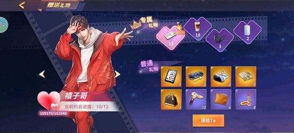 赠送礼物提升好感:每个合伙人都有四种专属礼物,橙色礼物加1000好感,紫色加400,蓝色加200,绿色加100。非专属礼物中,橙色加500,紫色加200,蓝色加100,绿色加50(升级不会清除已送好感)。