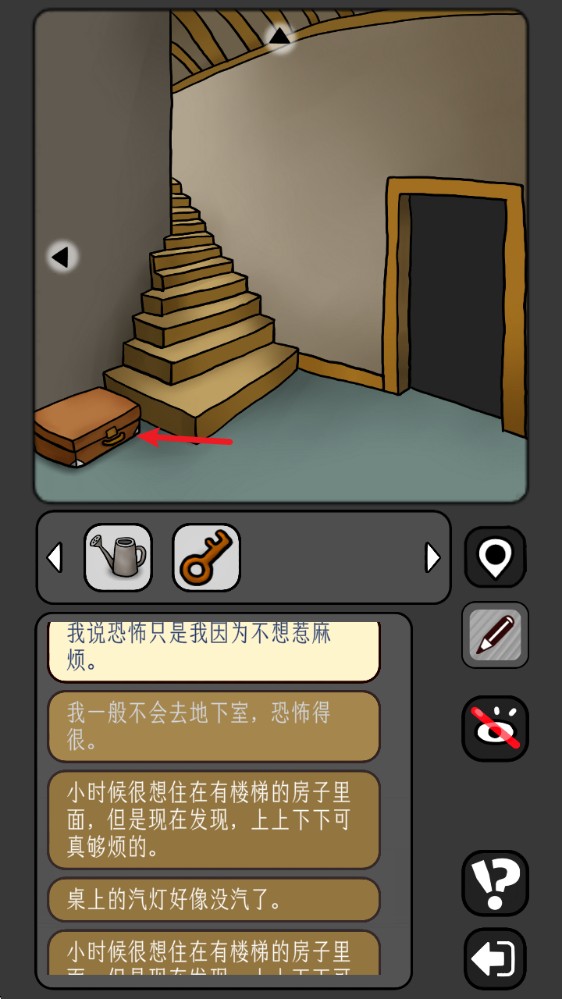 6、回到地下室,点击角落的行李箱,用【钥匙】打开,获取【斧头】和【汽油】。注意纸条上的箭头和纸张折角指示:左上-下、右上-左、中-上、左下-左、右下-右。