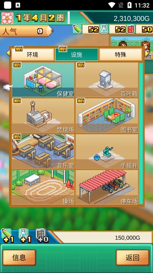 6、在建造界面中,建筑分为环境、设施、特殊三大类。选择【设施】分类,你可以看到保健室、百叶箱、图书馆、音乐室、操场等多种可建造项目。以【保健室】为例,进行建造操作;