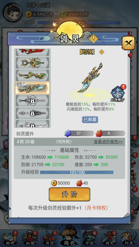 3、当剑灵等级达到上限时,需要对其进行进阶,进阶后,可获得抵抗属性提升。
