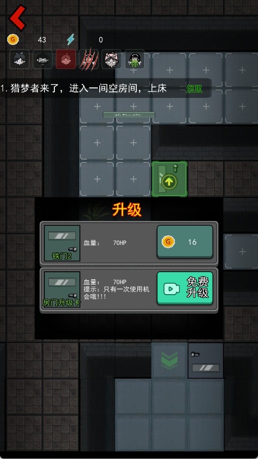 8、如果鬼再来,就可以升级门来无视他,如果他不来,就再生一个床。记住这个关键,前期的战斗基本上就过去了。