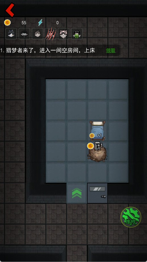 7、开局时优先升级床,不要急于花费金币,如果鬼直接来,就在门快要被破的时候升级,加上三个扫帚就可以将其赶走。
