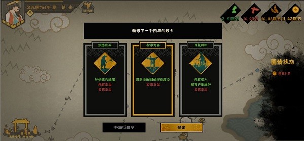 您将定期在朝会上制定国家的发展方向,如经济、外交、军事等。通过合理的策略搭配,您将能所向披靡,战无不胜。每个国家都有其独特的方针,让每个国家都独具特色。