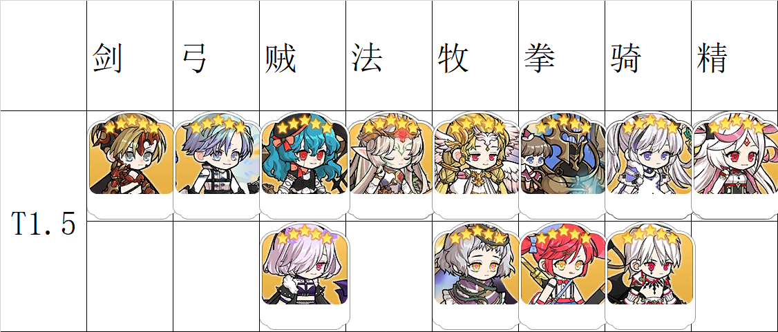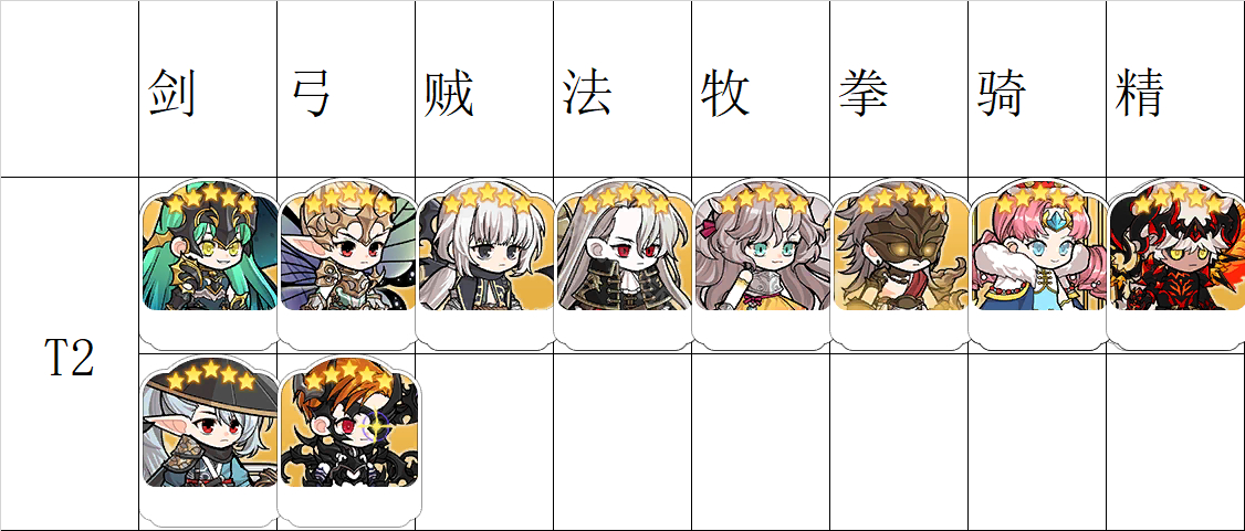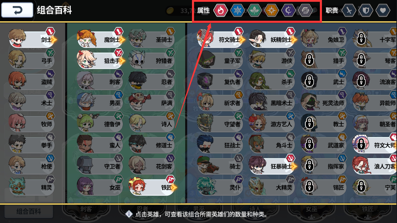 所有英雄被分为六种属性,如图中红色方框所示,分别是火焰、寒冰、自然、光明、黑暗、金属;同时,英雄还分为八种类型,从上到下分别是:剑士、弓箭手、盗贼、法师、牧师、拳师、枪手、精灵。