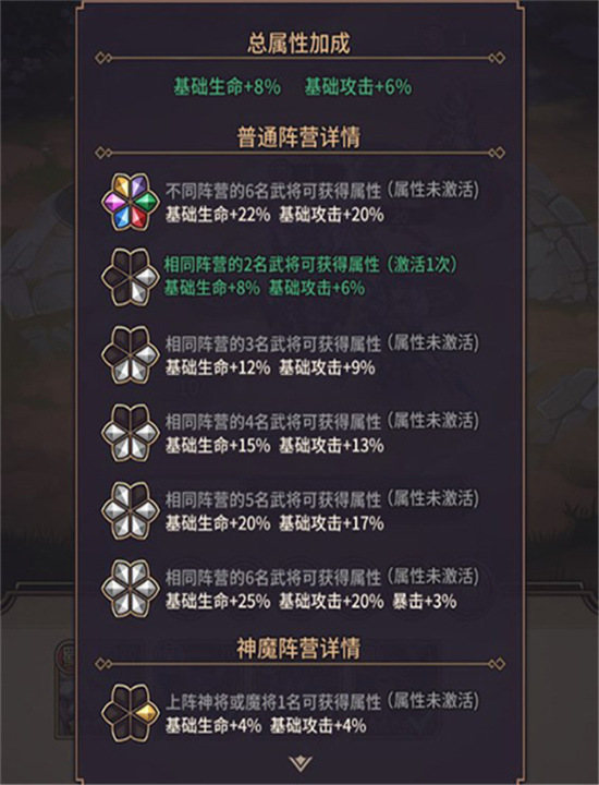3、不同武将阵营之间还存在着羁绊加成,羁绊越多,提供的额外属性加成就越多,从而大幅提升队伍的战斗力。
