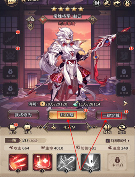 1、玩家可以提升武将的等级,进行进阶突破,解锁更多武将技能,并且可以一键穿戴装备,大幅增强战斗力。