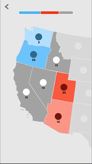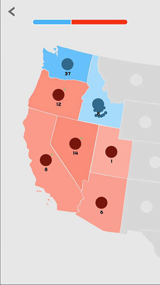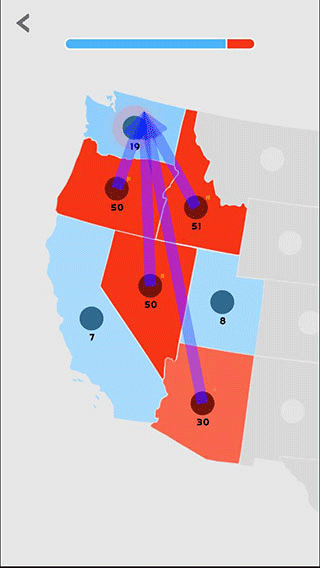 3、通过点击并拖动地图中间的圆形标记来派遣军队进行进攻和扩张。圆形标记旁边的数字代表军队的数量,这个数字会随着时间增长,数量越多,颜色越深。