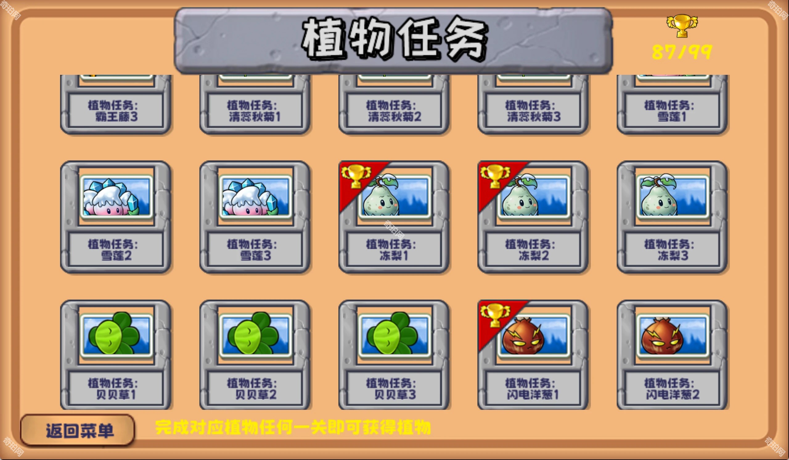 2.调整东方竹子3、爆炸坚果2、火焰玉米投手1、阳光蓓蕾2、闪电洋葱1、霸王藤2/3、西北海龙王2/3、泡椒炸弹1、石果子2植物任务