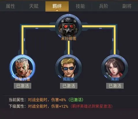 属性、天赋、羁绊、技能、兵阶、副将等标签,进一步提升英雄的能力: