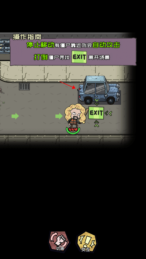 3、通过滑动屏幕来移动角色,你会遇到僵尸。靠近僵尸后,它们会自动攻击。击败所有僵尸后,找到“EXIT”标志离开当前区域。